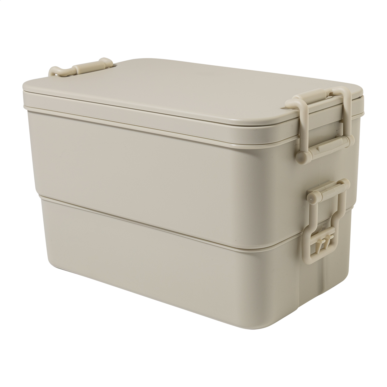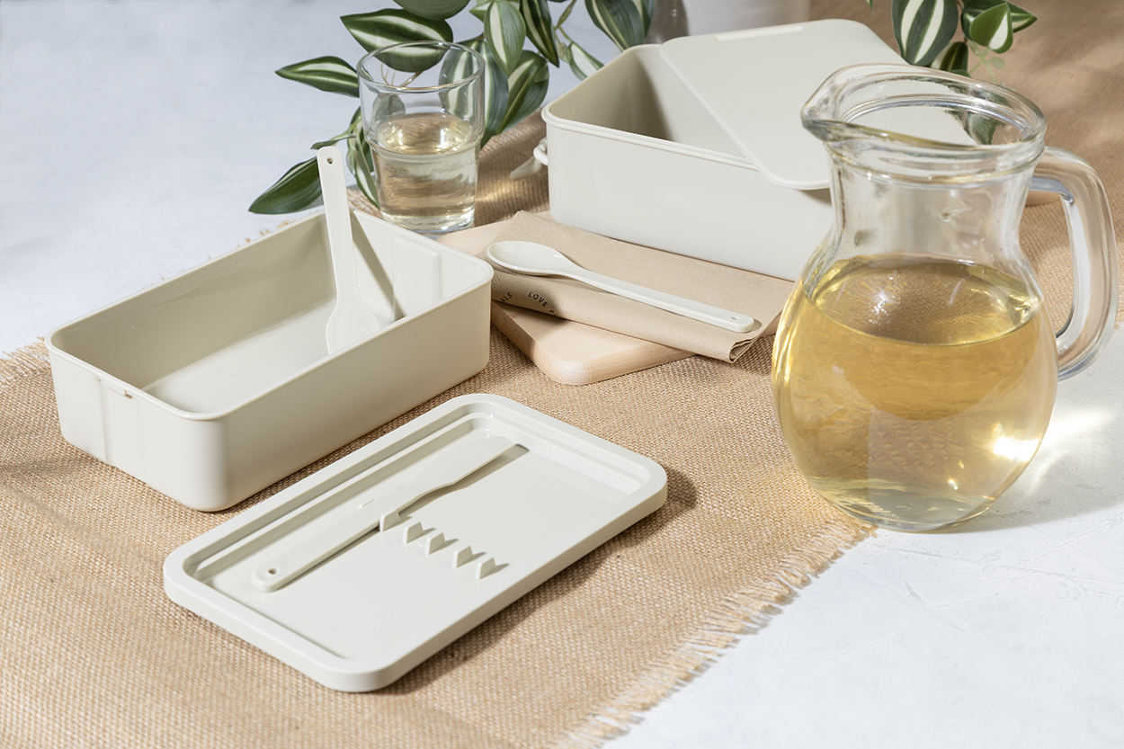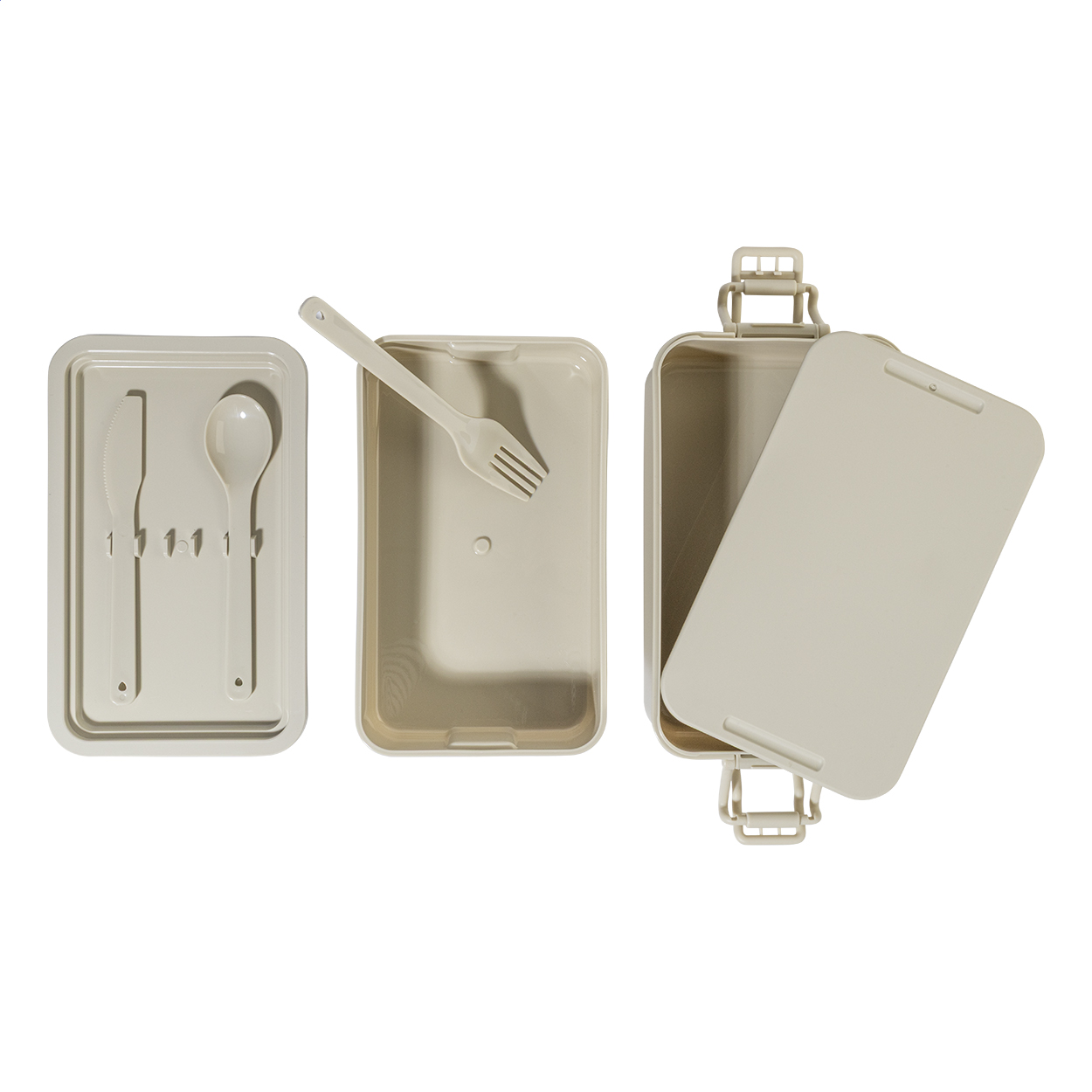 Box na jídlo z PP plastu se sadou příborů (vidlička, lžíce a nůž), zapínáním na přezku a 2 přihrádkami (1000 ml a 800 ml). Stohovatelný design pro kompaktní skladování.