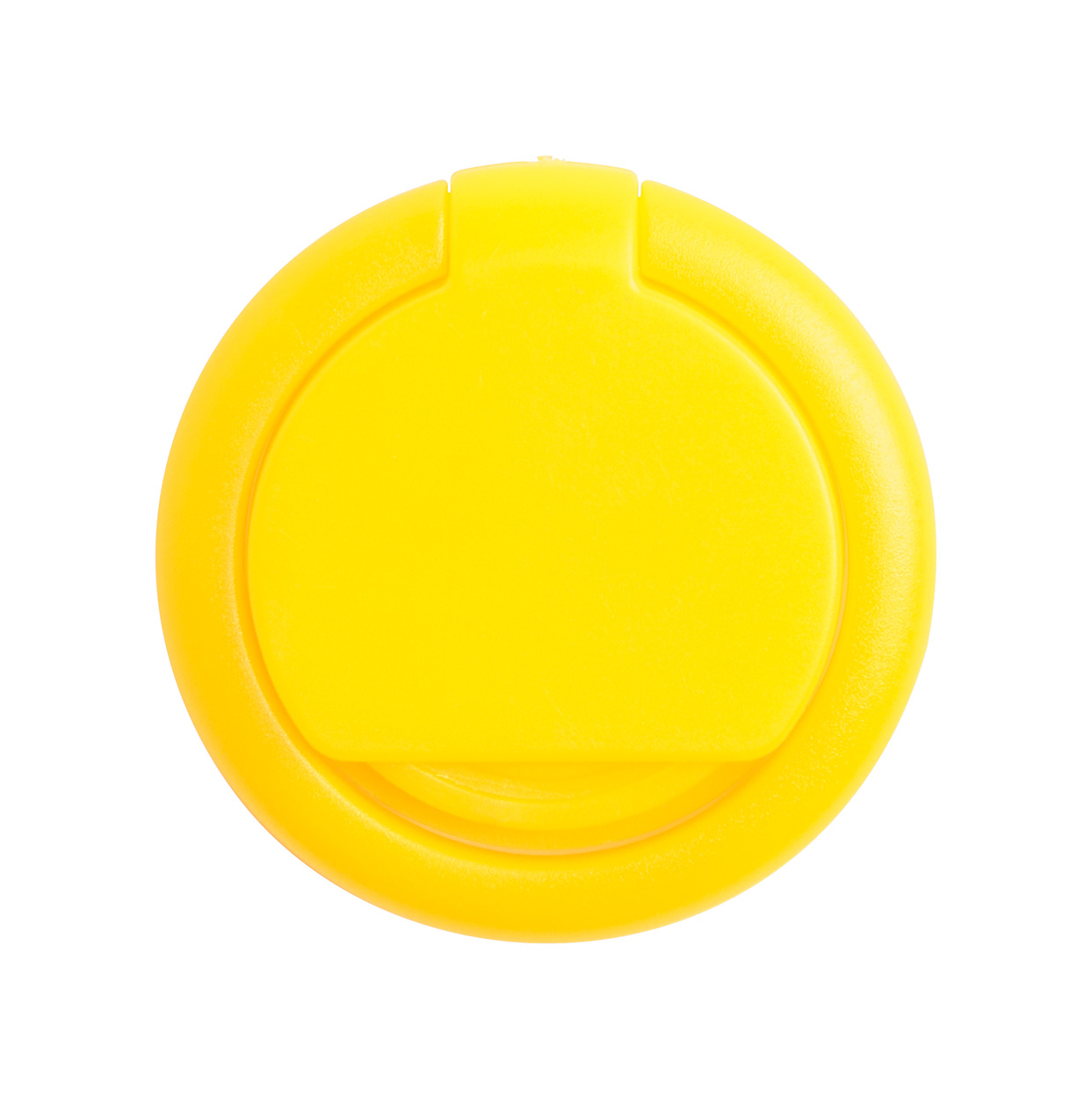 Kulatý, plastový stojánek na mobil s protiskluzovou úpravou a mincí do nákupního vozíku.