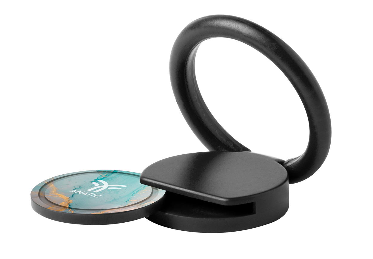 Kulatý, plastový stojánek na mobil s protiskluzovou úpravou a mincí do nákupního vozíku.