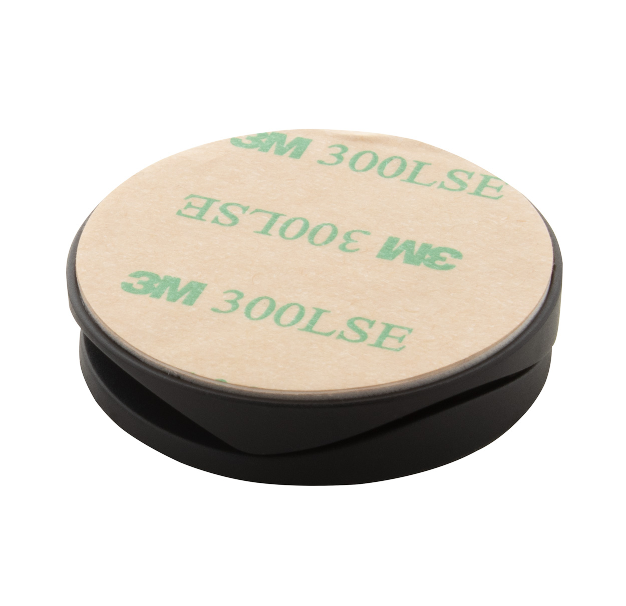 Bambusem potažený, kulatý, plastový stojánek na mobil se samolepicí základnou.