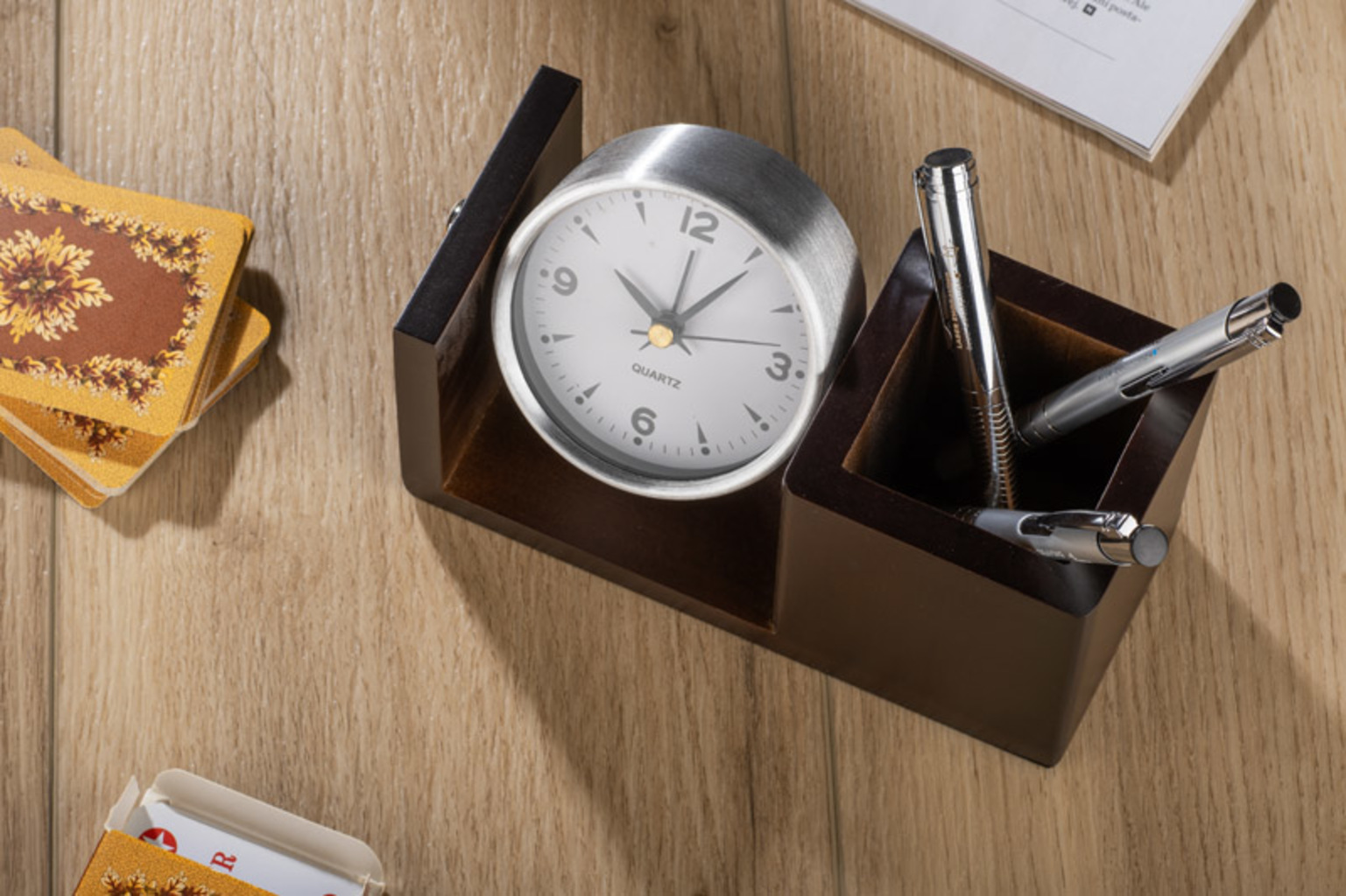 Hodiny vyrobené z kovu s velkou bílou ciferníkem. Je umístěn na elegantním dřevěném podkladu z masivního dřeva. Hodiny mají také místo pro kancelářské potřeby. Tento gadget bude určitě cennou dekorací jakéhokoli pracovního stolu. Má jak skvělý design, tak i funkčnost. Označení může být umístěno na dřevěné části určené pro kancelářské potřeby.