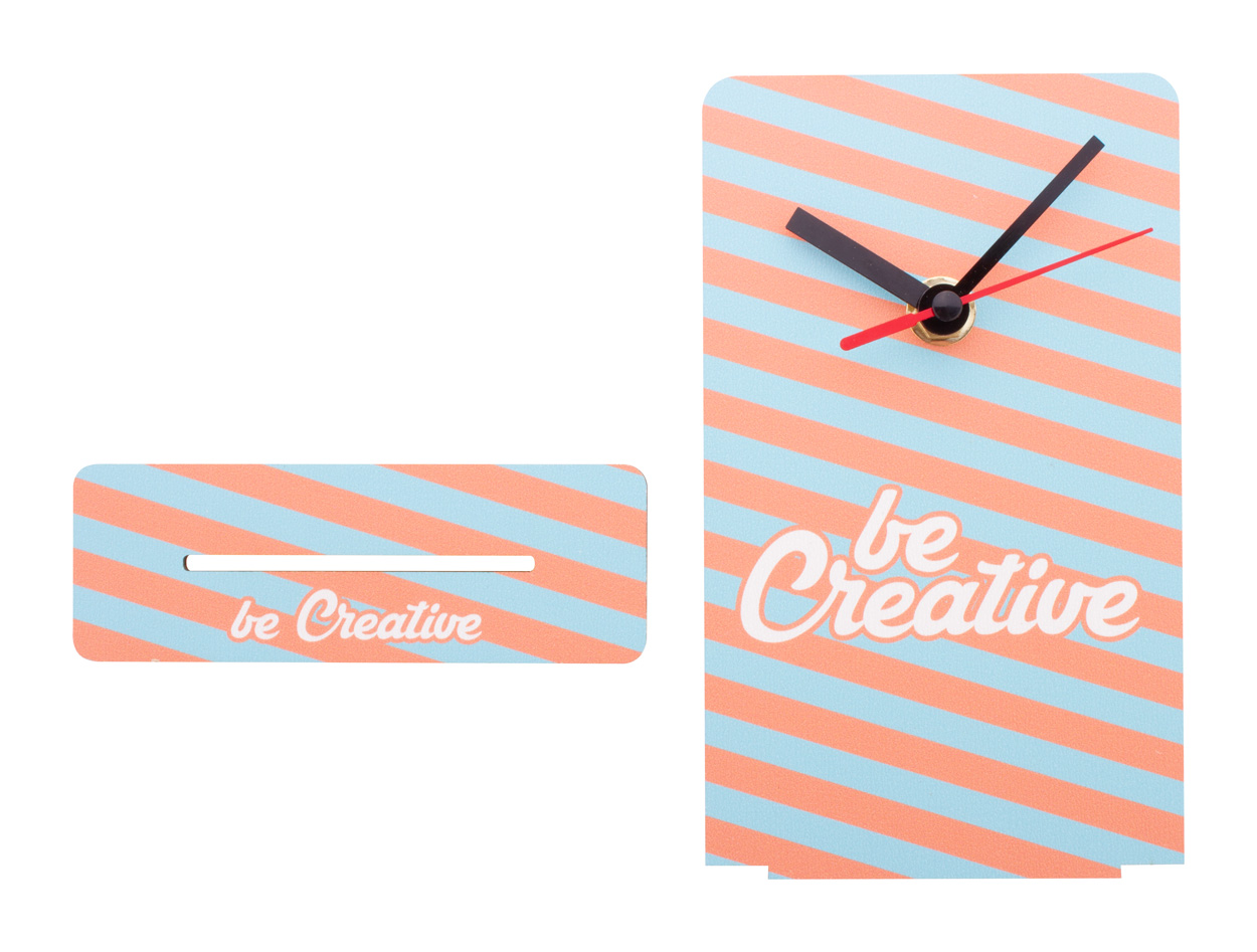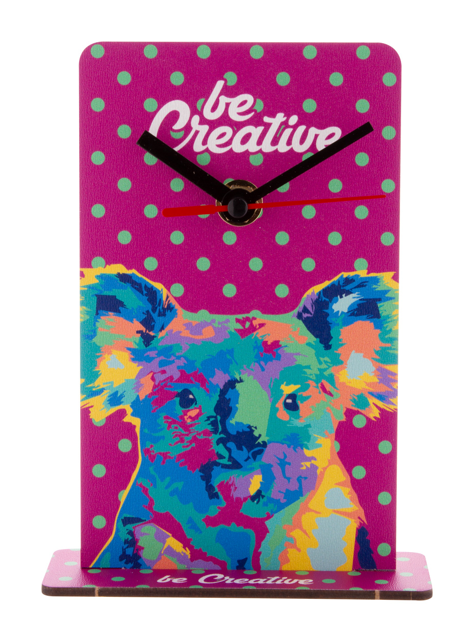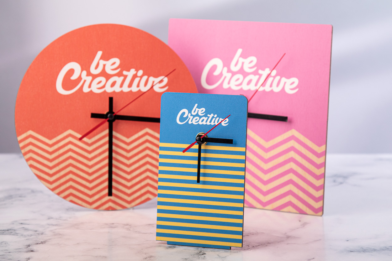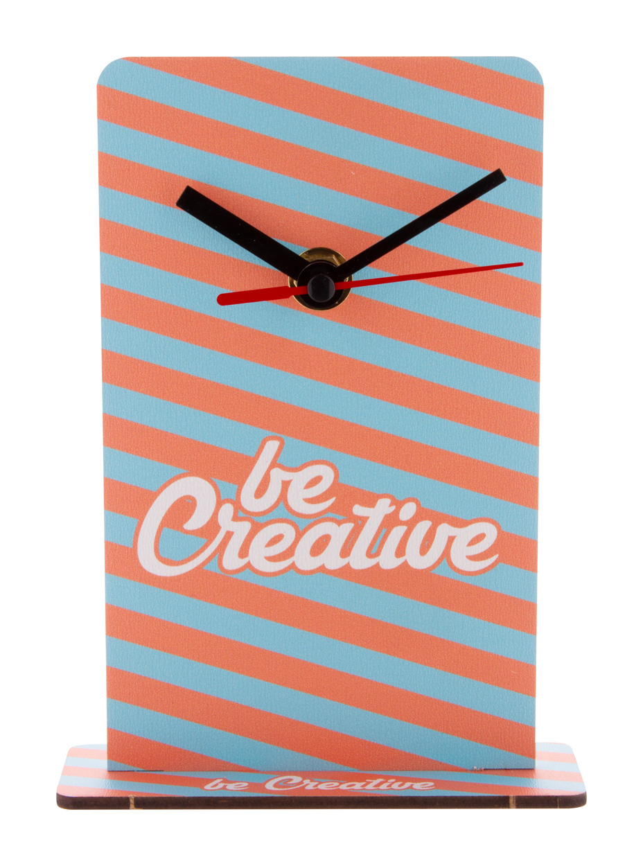 Dřevěné stolní hodiny HDF vyrobené na zakázku s vlastní grafikou. Dodává se bez 1 AA baterie. Cena zahrnuje UV LED tisk, nezahrnuje tiskovou přípravu. Min. mn.: 50 ks.