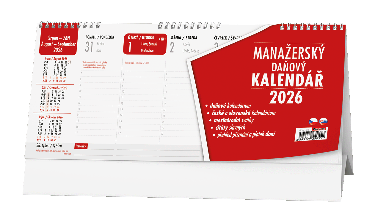 Manažerský pracovní kalendář s týdenním kalendáriem a přehledem daňových termínů. Červeno-bílá barevná kombinace a citáty slavných oživí Váš den.