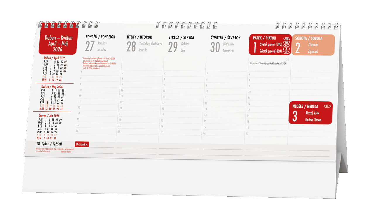 | Barva a materiál: | Papír: ofset, 70g/m2 Obálka: křída lesk 135 g/m2 Stojánek je z kvalitní bílé lepenky 600g/m2 Dělená kovová spirála "twin wire" | ||||||||||||||