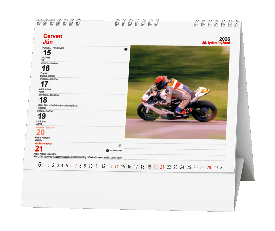 Stolní kalendář s týdenním kalendáriem pro milovníky rychlých motorek.
