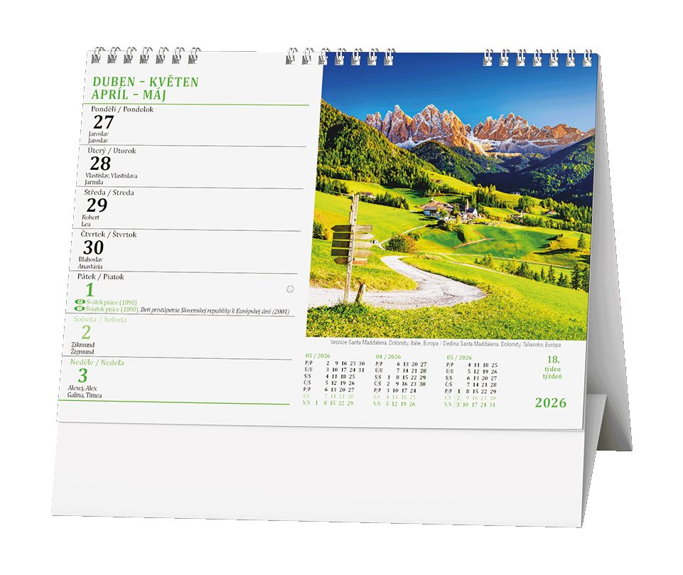 | Barva a materiál: | Papír: G print, 100 g/m2 Obálka: křída lesk 135 g/m2 Stojánek je z kvalitní bílé lepenky 600g/m2 Dělená kovová spirála "twin wire" | ||||||||||||
