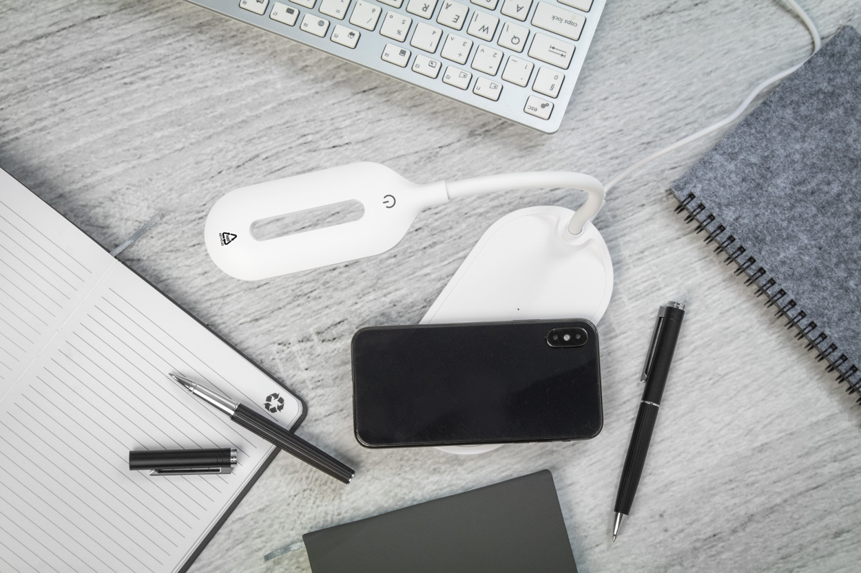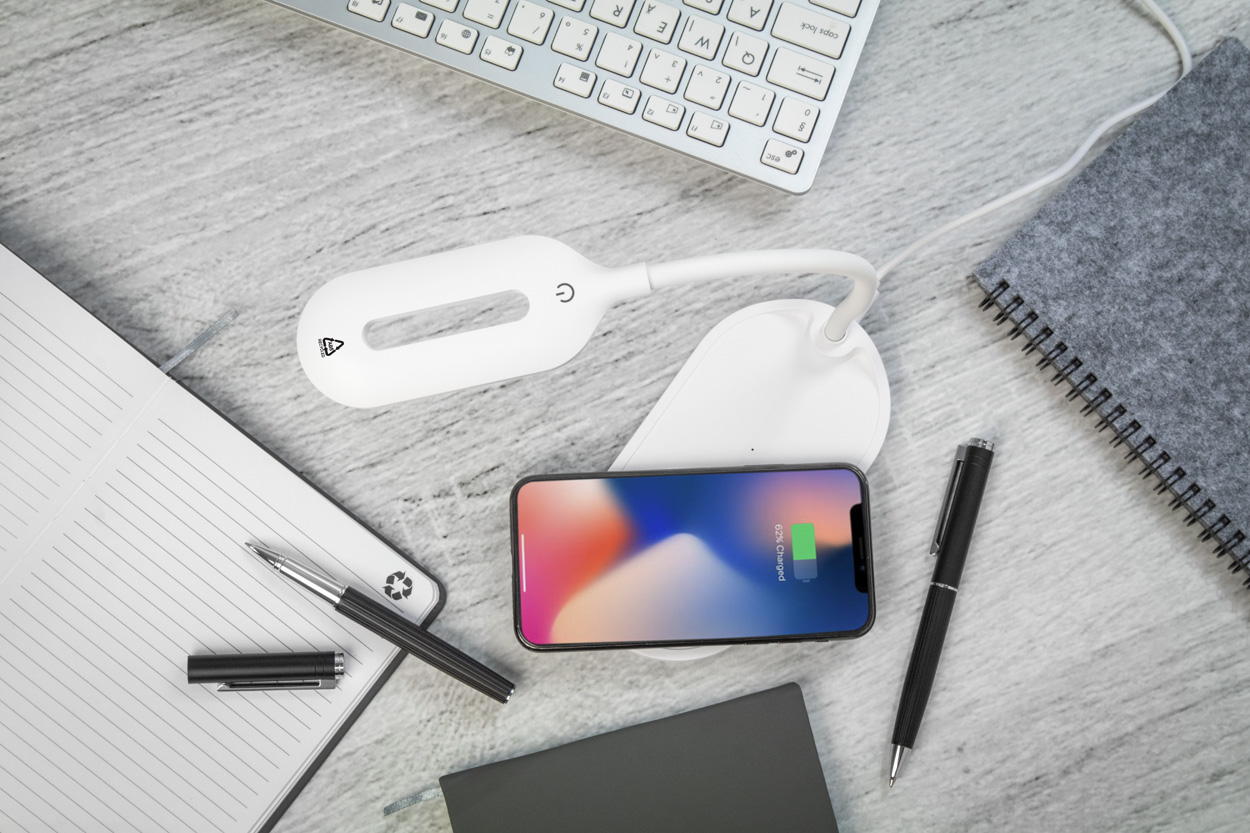 Multifunkční stolní lampa z recyklovaného ABS se zabudovanou bezdrátovou rychlonabíječkou (15W). S 10 LED diodami, dotykovým tlačítkem a nastavitelným jasem. Včetně USB nabíjecího kabelu.