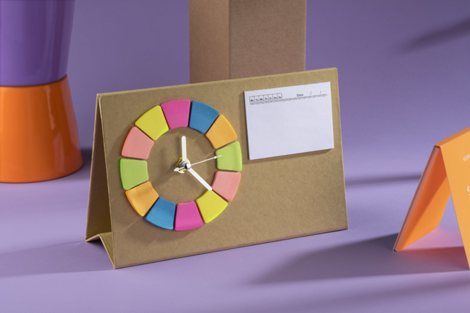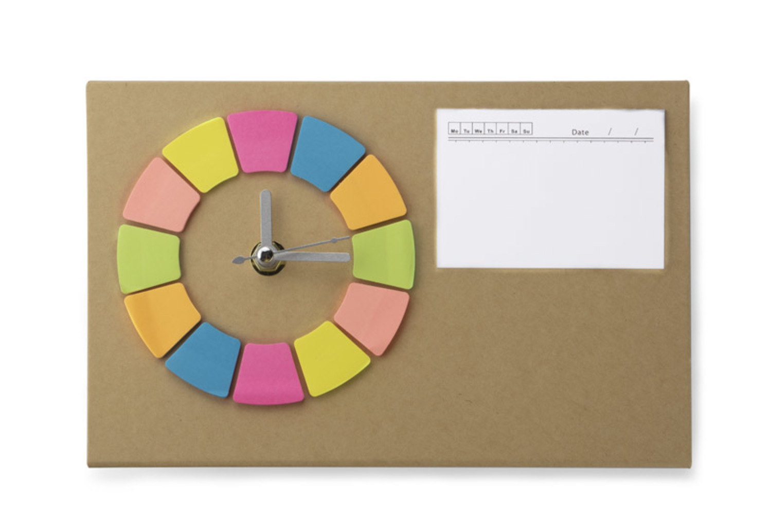POSIT jsou perfektní stolní hodiny. Tradiční čísla na ciferníku byla nahrazena lepivými poznámkovými kartami (25 ks / každá barva), které nám umožňují vkládat informace o důležitých schůzkách přímo na ciferníky nebo je používat tradičním způsobem - označovat důležité dokumenty. Vedle hodin je k dispozici 12 listů poznámkového bloku, které vám umožní zapsat si nejdůležitější informace, které chcete mít vždy na dohled. Všechno je vyrobeno z silné lepenky v přirozené barvě.