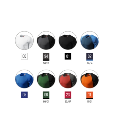 dvoubarevné provedení (vyjma barev 00, 01, 05), střih s bočními švy, úzký lem průkrčníku z žebrového úpletu 1:1 s 5 % elastanu, vnitřní část průkrčníku začištěna páskou z vrchového materiálu, dlouhé raglánové rukávy s manžetou, manžeta z žebrového úpletu 1:1 s 5 % elastanu, Přesunutí produktu pod značku RIMECK®. V rámci jedné zásilky se mohou objevit produkty s původním i novým labelem. Tato skutečnost není důvodem k reklamaci.