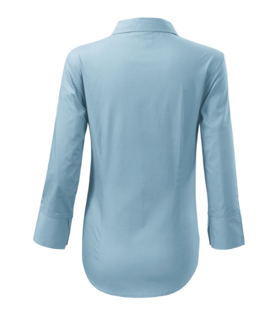projmutý střih s bočními švy, záševky na zadním dílu, pasové a prsní záševky, dvoudílný košilový límec, přední kraje začištěny légou, 3/4 rukávy s rovnou vysokou manžetou a rozparkem, knoflíčky v barvě materiálu (1 náhradní navíc), tvarovaný dolní kraj