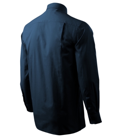 klasický střih s bočními švy, dvojité sedlo a záhyby na zadním dílu, dvoudílný košilový límec, přední kraje začištěny légou, nakládaná náprsní kapsa, dlouhé rukávy s kulatou manžetou na 1 knoflíček, knoflíčky v barvě materiálu (2 náhradní navíc)