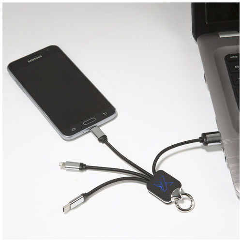Dobíjecí kabel se světelným logem, gumovým povrchem, kovovými doplňky a třemi výstupními konektory (USB-C, Android, iPhone). Lze nabíjet až tři zařízení současně. Délka kabelů (včetně zástrček): 10 cm. Recyklovaný PET kabel a obal jsou vyrobeny z recyklovaného papíru a recyklovaného plastu.