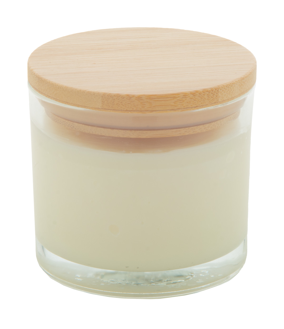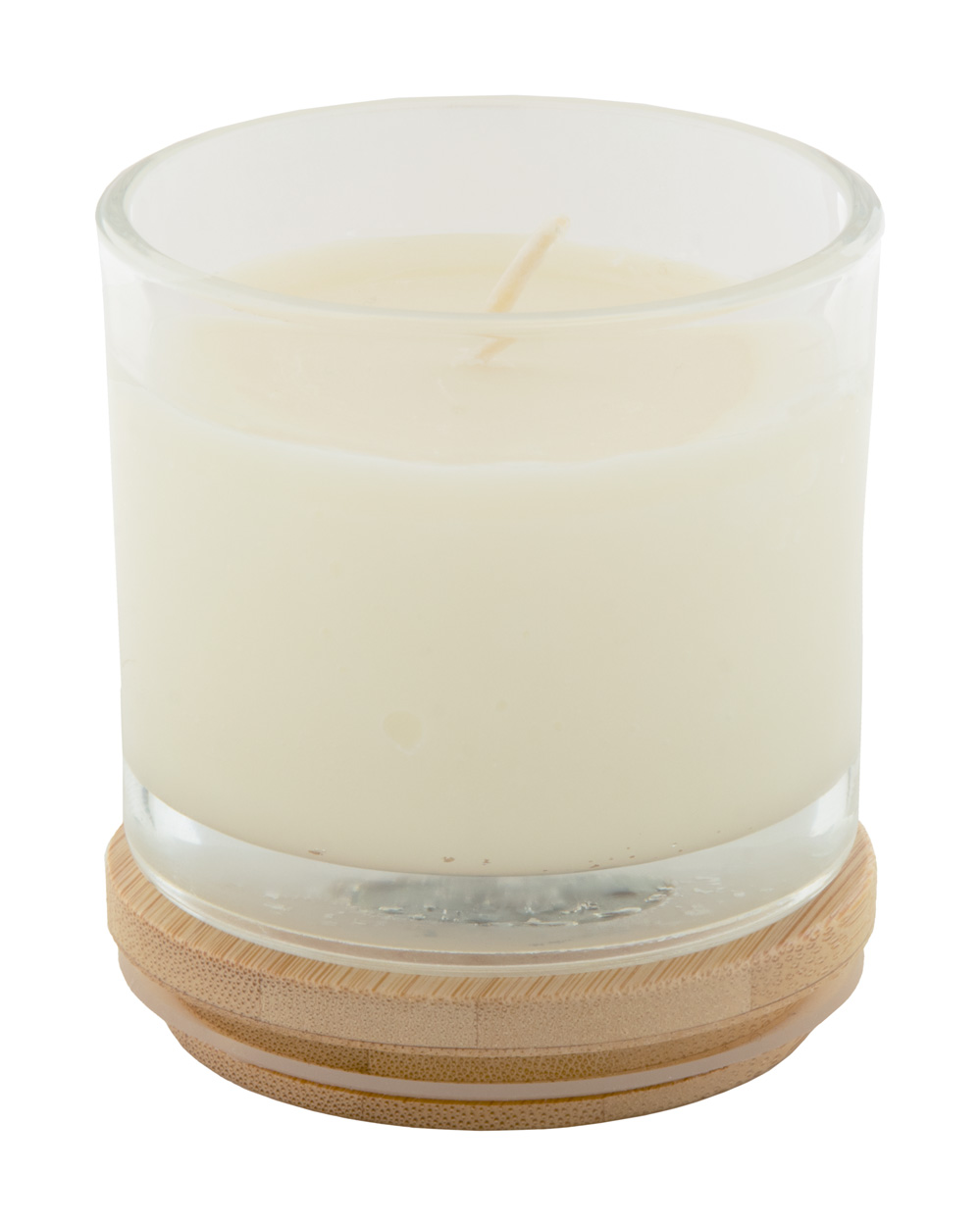 Rostlinná vosková svíčka s vůní vanilky ve skleněném držáku s bambusovým víčkem. S 95 gramy vosku. V kraftové papírové krabici.