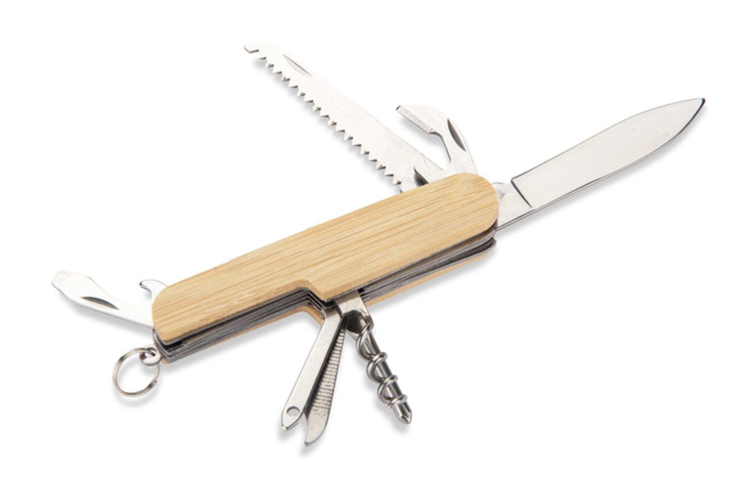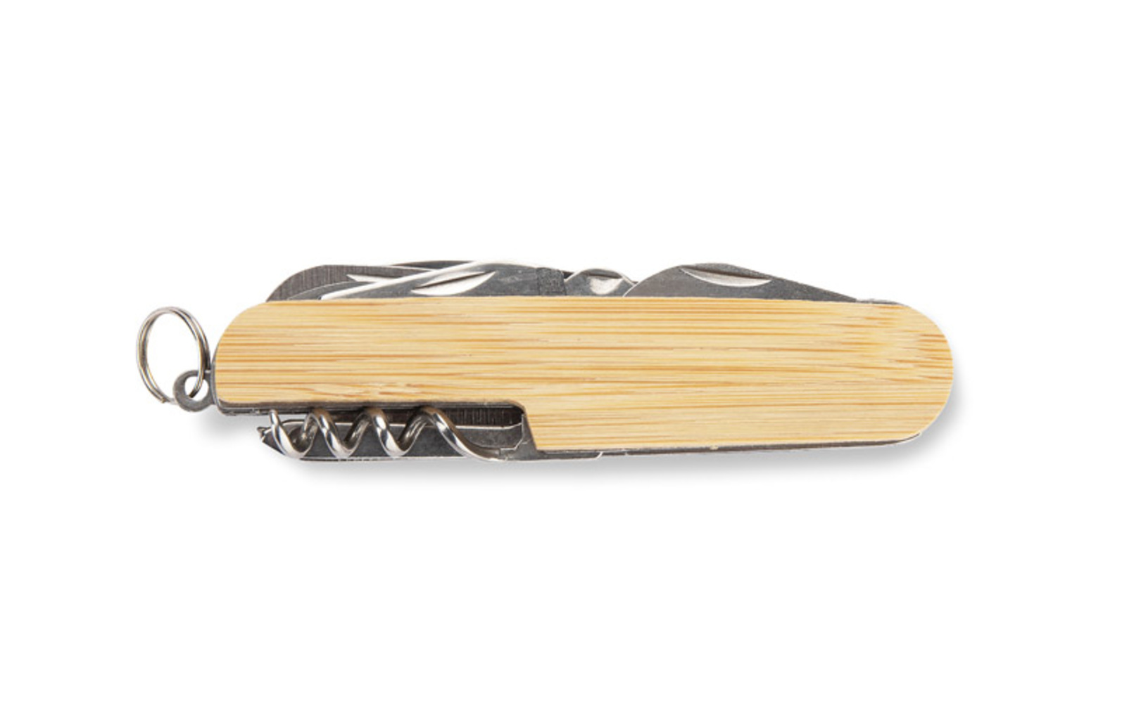Kapesní nůž KANA s bambusovou rukojetí vyniká svým jedinečným, přírodním vzhledem. Vybaven funkcemi užitečnými jak v každodenním životě, tak i v terénu: nůž, pilka, škrabka na ryby, otvírák na konzervy a láhve, šroubovák, vývrtka, šídlo, děrovač na kůži a kroužek na klíče. Praktický reklamní předmět, který se hodí do každé situace.
