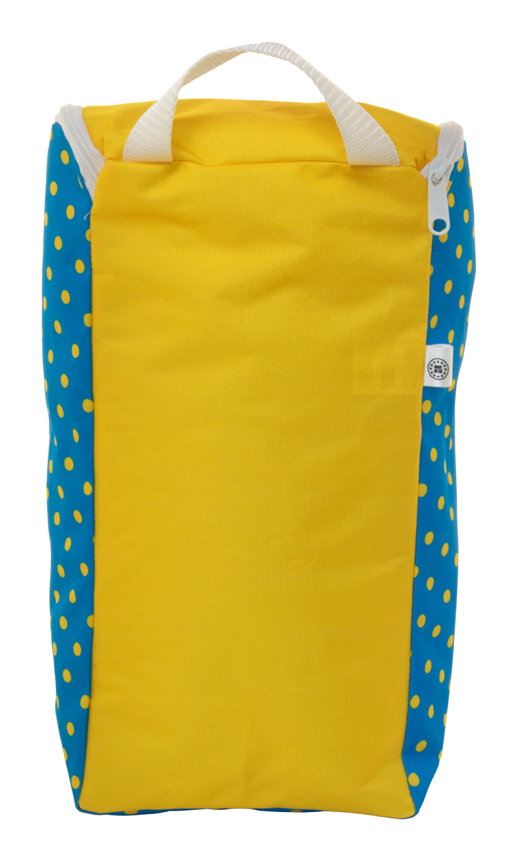 Na zakázku vyrobená taška na boty na zip z 600D RPET polyesteru s uchem. S celoplošnou sublimační tištěnou grafikou a výrazným štítkem RPET. MOQ: 50 ks.