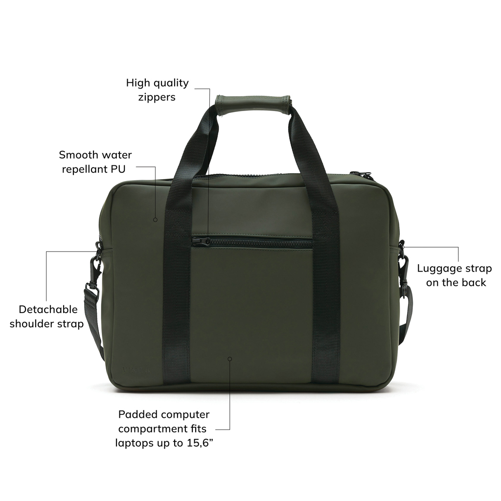 Taška na notebook s moderním a čistým designem. Spojení funkce a formy: kromě běžné kapsy na notebook má tato taška také prostor pro pera a tužky, dokumenty a další věci. Taška je vyrobena z materiálu odpuzujícího vodu, má ramenní popruh i ucha na nošení. Na zadní straně je vybaven popruhem pro umístění na madlo kufru.