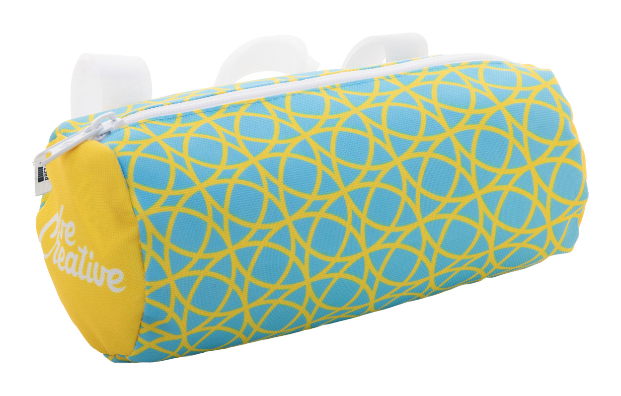 Na zakázku vyrobená taška na řídítka na zip z 600D RPET polyesteru s nastavitelnými popruhy na suchý zip. S celoplošnou sublimační tištěnou grafikou a výrazným štítkem RPET. MOQ: 50 ks.