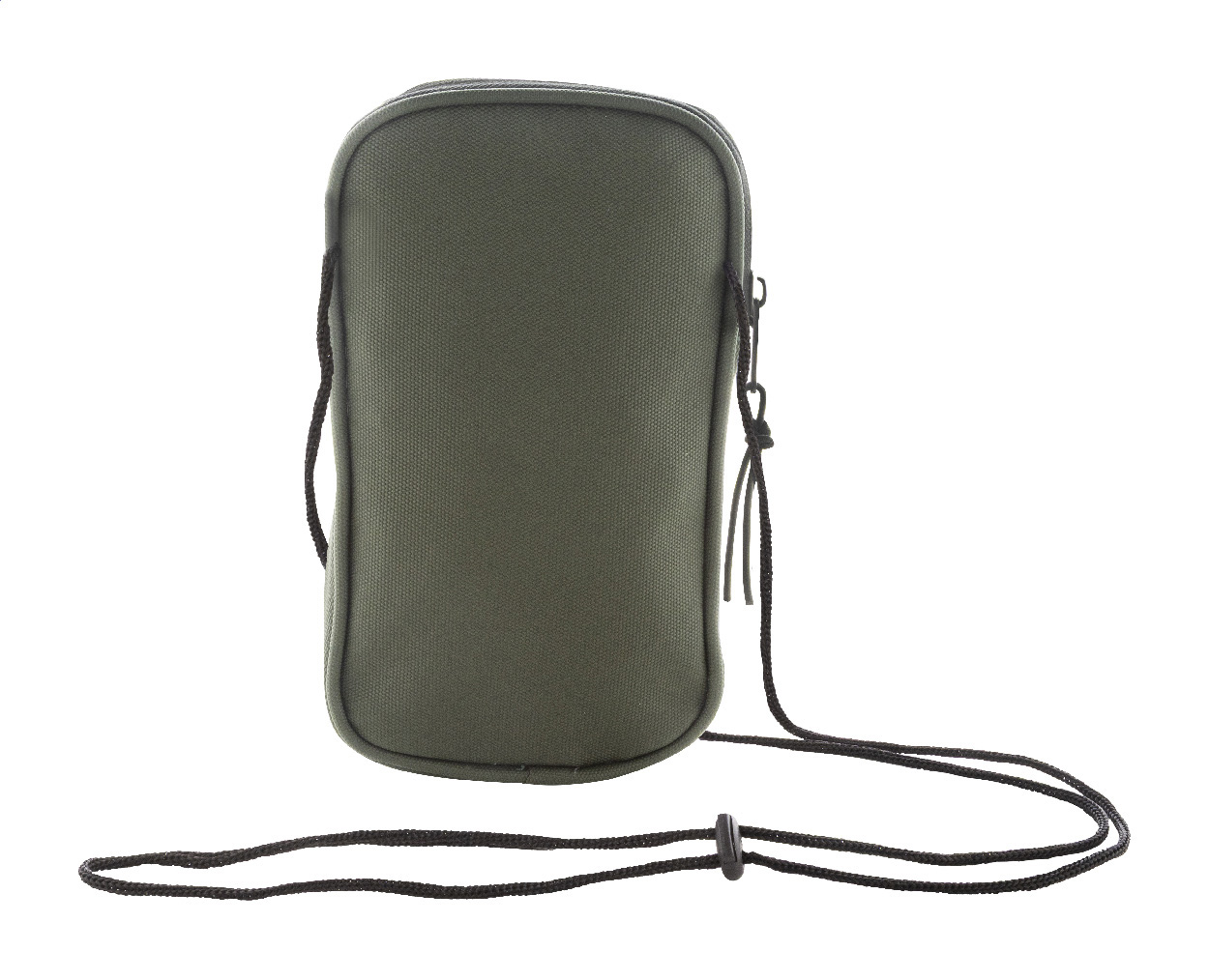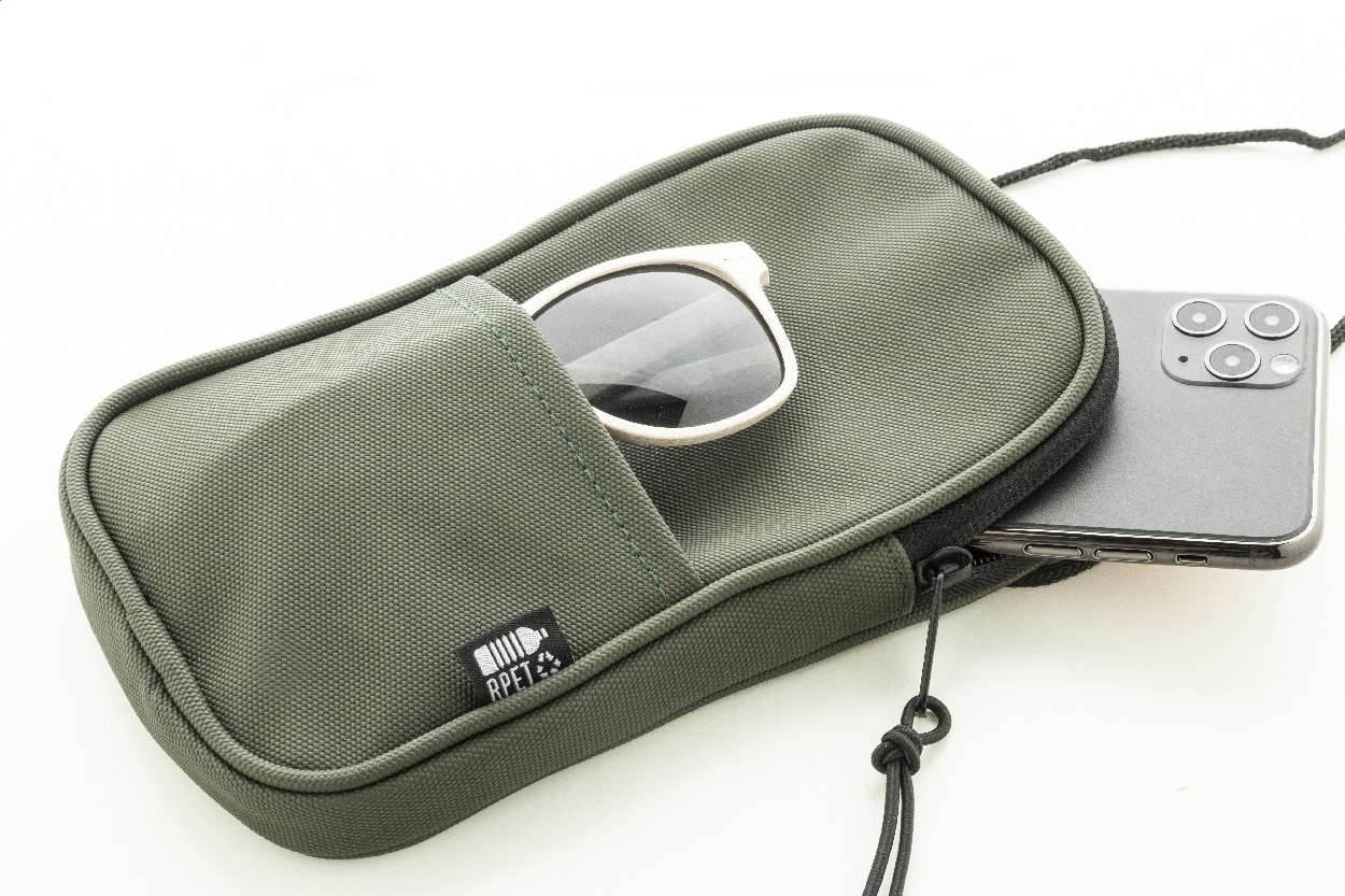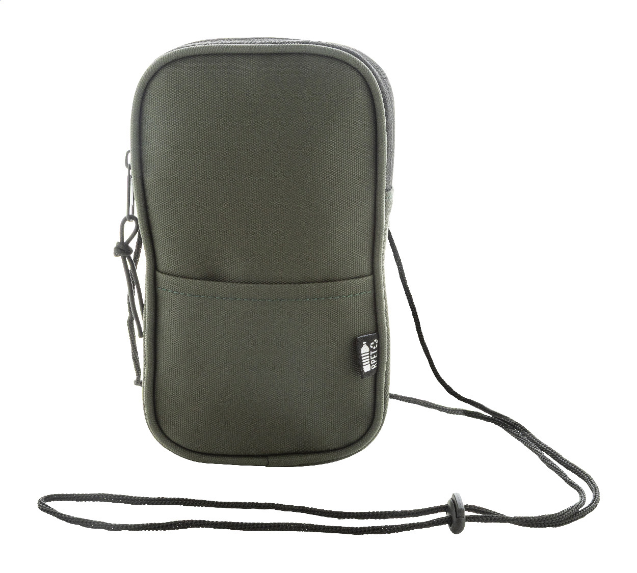 Voděodolná RPET crossbody taška na mobilní telefon s hlavní přihrádkou na zip, přední kapsou a nastavitelnou šňůrkou. Polyester RPET 600D potažený PU, s výrazným štítkem RPET.