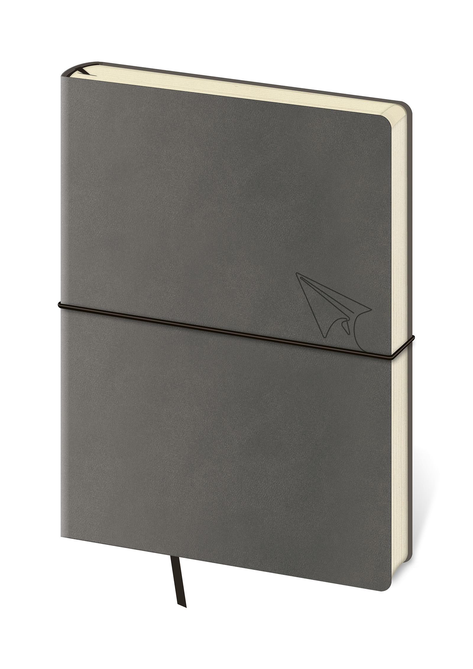 Moderní zápisník v měkké ohebné vazbě s kulatou příčnou gumičkou přes hřbet představuje nejnovější způsob zpracování. Zápisník je příjemný do ruky díky matné kožence a lehký díky měkkým deskám. Materiál desek se hodí na sleporažbu, která na kožence vynikne.