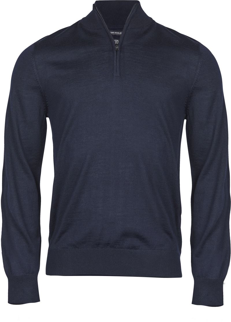Klasický pletený svetr v tvarově stabilní merino kvalitě, vypasovaný střih, žebrované manžety na rukávech a lemu, stojatý límec s 1/4 SBS zipem, pevný úplet, italská smíšená příze, lze prát na 30° v programu vlna