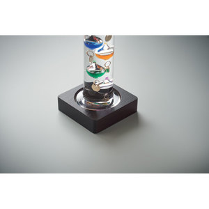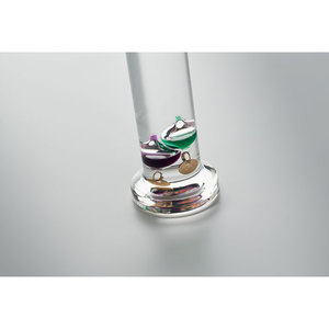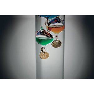 Teploměr Galileo ve skle s pěti barevnými plovoucími koulemi, které ukazují teplotu od 18 °C do 26 °C: Červená 26°, modrá 24°, oranžová 22°, zelená 20° a fialová 18°. Nejnižší koule v horní skupině ukazuje teplotu okolí.
