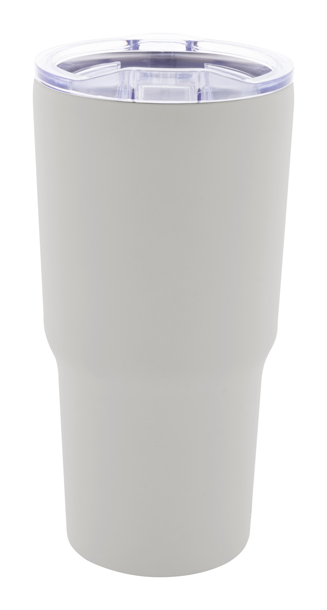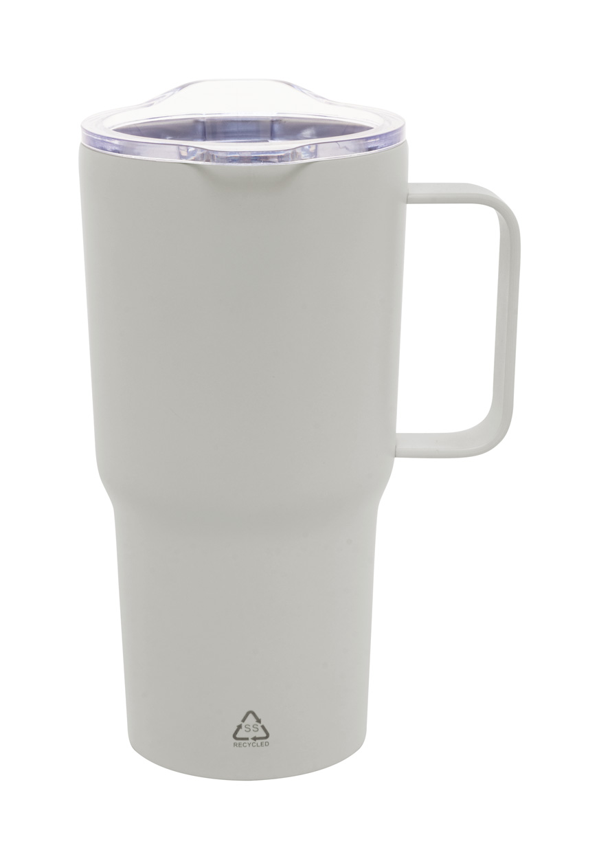 Dvoustěnný vakuově izolovaný termo hrnek z recyklované nerezové oceli s plastovým víčkem na pití z PS. 600 ml.