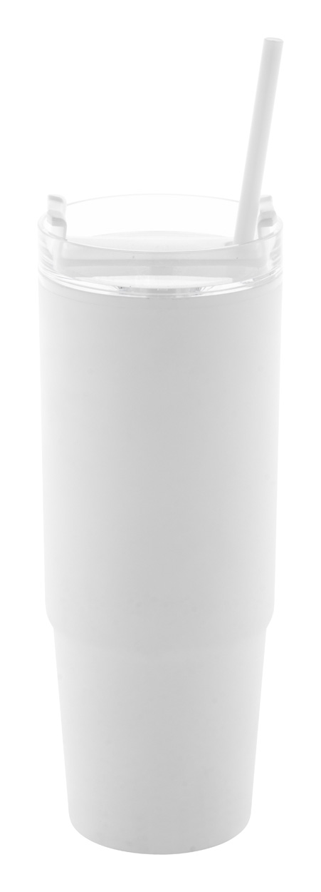 Dvoustěnný termo hrnek z recyklovaného PP plastu s plastovým víčkem na pití a brčkem. 900 ml.