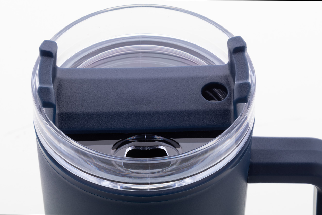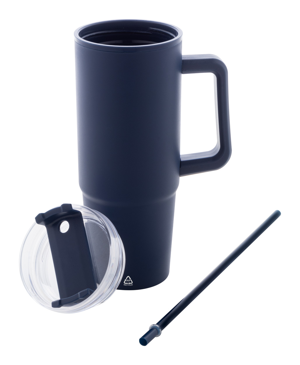 Dvoustěnný termo hrnek z recyklovaného PP plastu s plastovým víčkem na pití a brčkem. 900 ml.