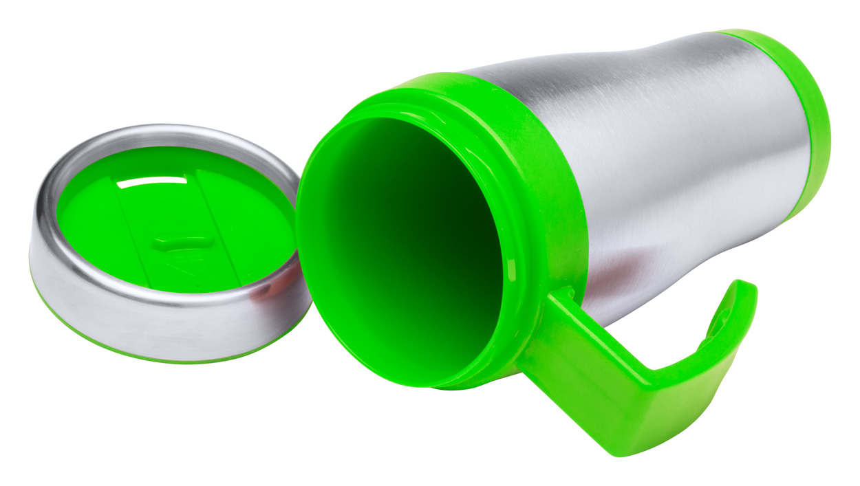 Nerezový termo hrnek z nerez oceli s barevnými plastovými částmi a uchem, 450 ml. V dárkové krabičce.