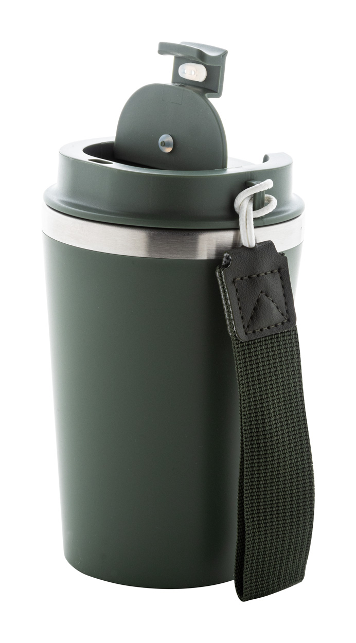 Dvoustěnný termo hrnek z recyklované nerezové oceli s vnějším PP plastem a víčkem na pití. S popruhem na přenášení RPET. 350 ml.