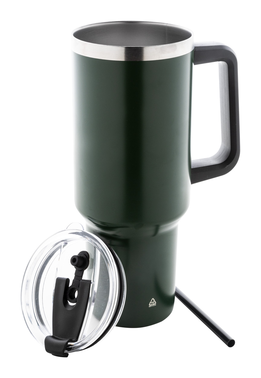 Dvouplášťový vakuově izolovaný termo hrnek z recyklované nerezové oceli s PS víčkem na pití a PP brčkem. 1200 ml.