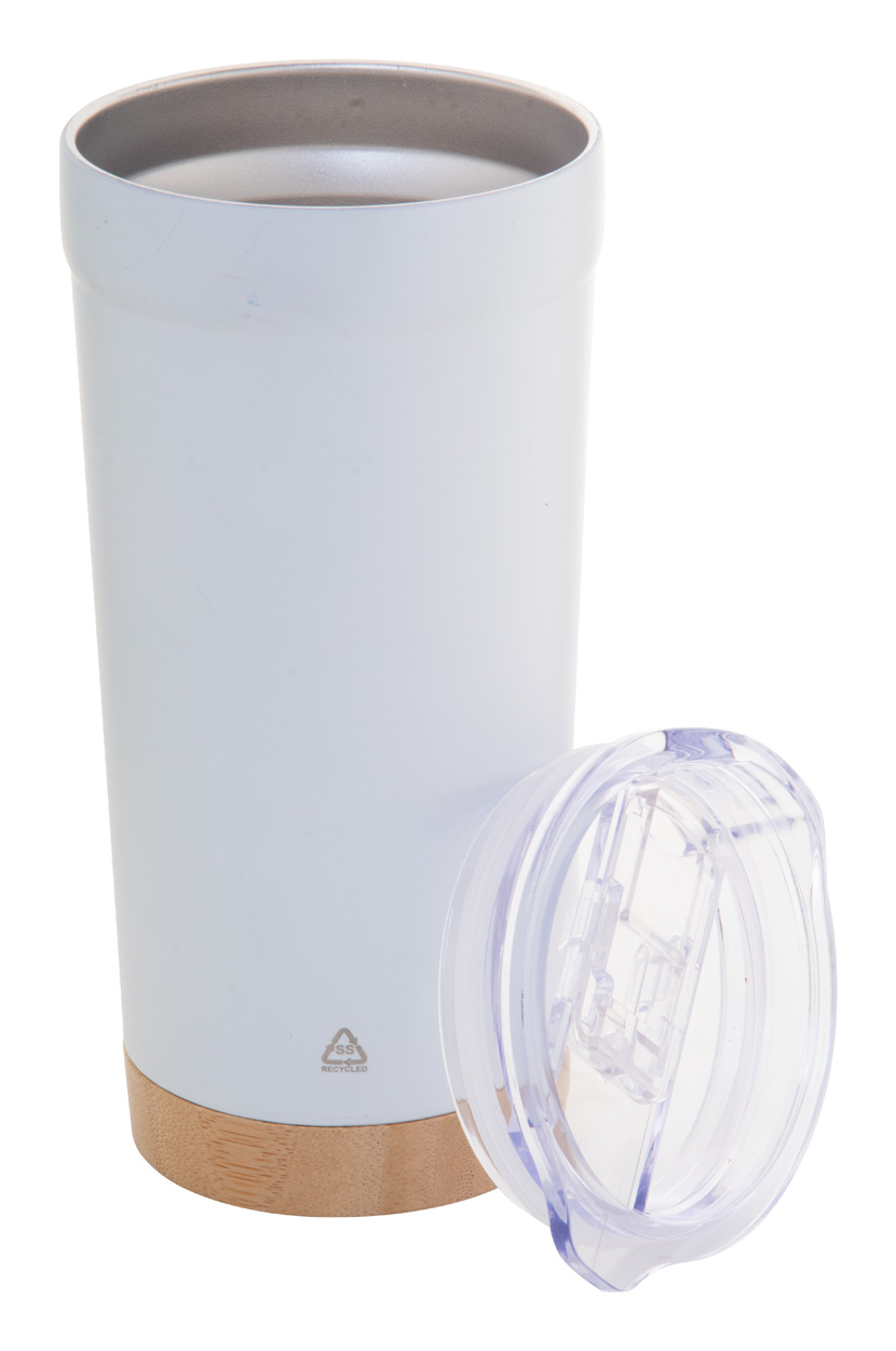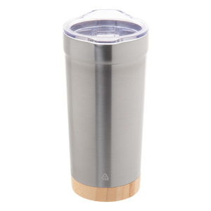 Dvoustěnný vakuově izolovaný termo hrnek z recyklované nerezové oceli s bambusovým dnem a AS plastovým víčkem na pití. 600 ml.