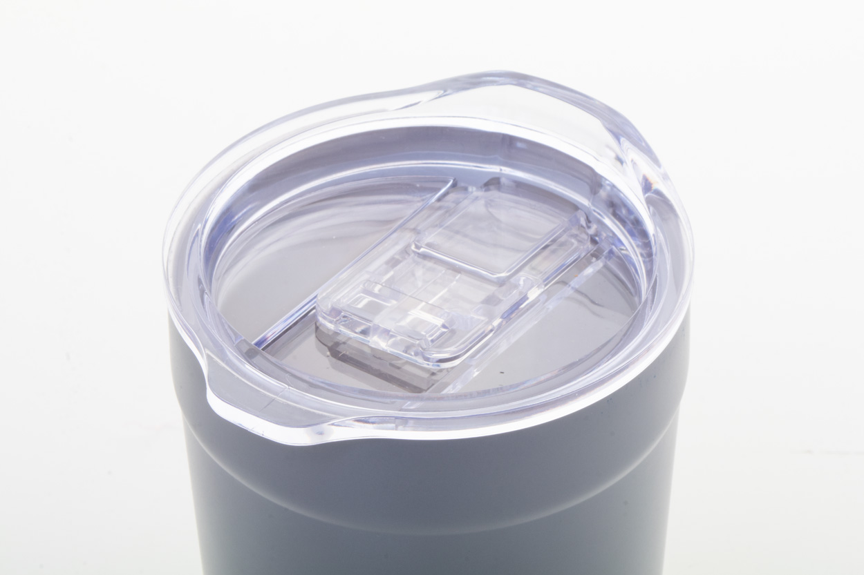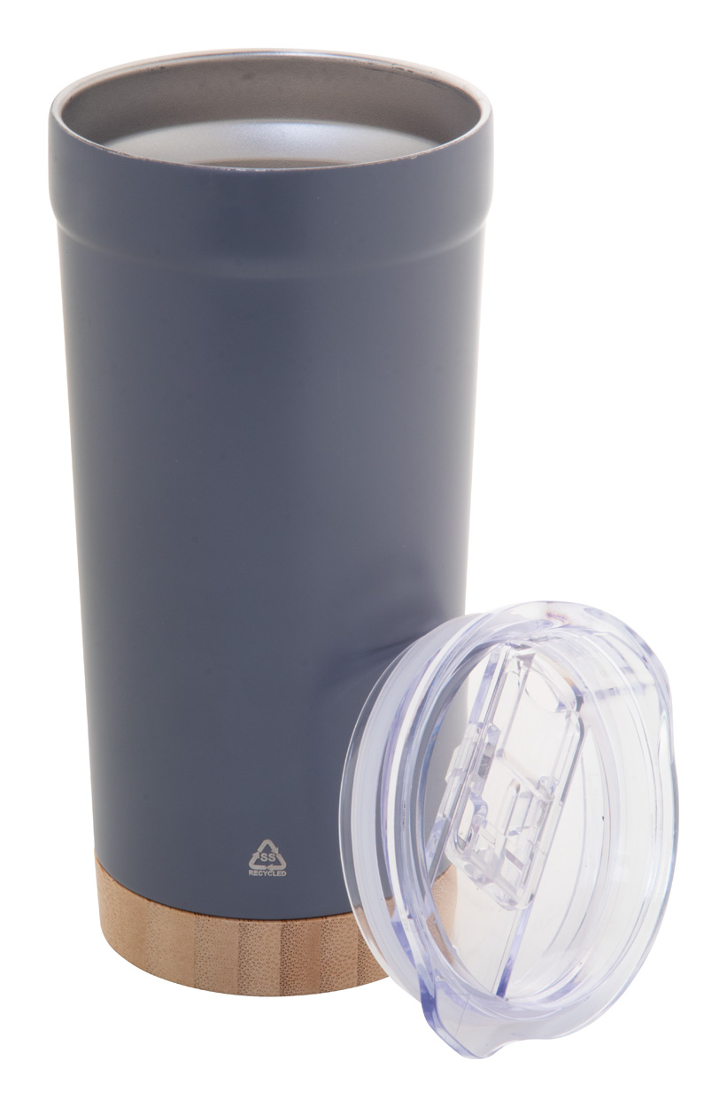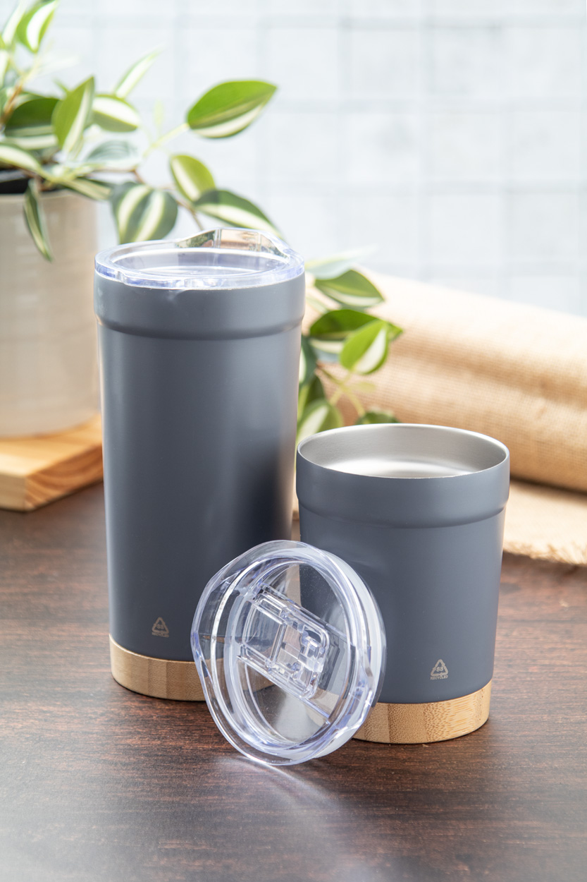 Dvoustěnný vakuově izolovaný termo hrnek z recyklované nerezové oceli s bambusovým dnem a AS plastovým víčkem na pití. 600 ml.