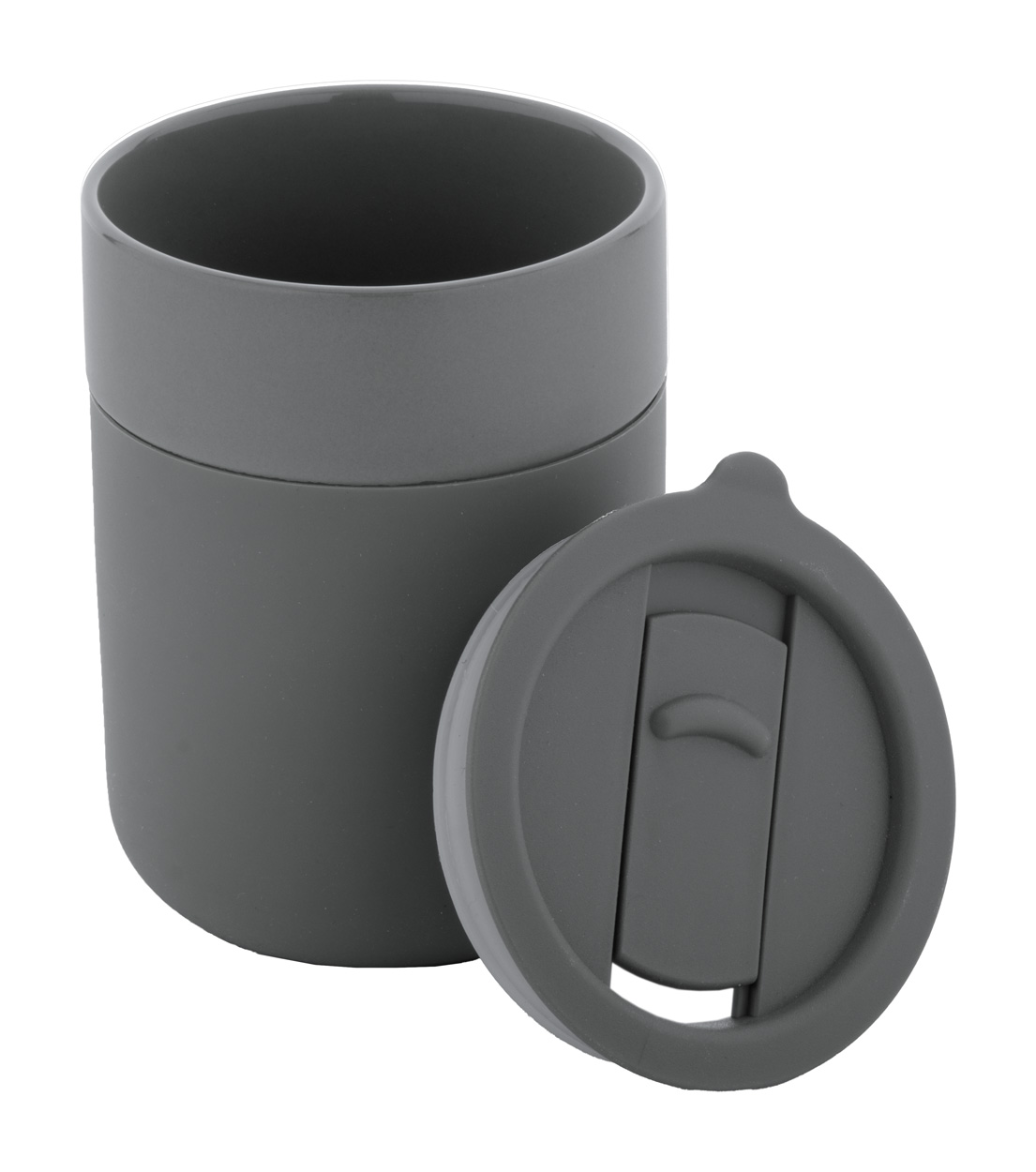 Silikonem potažený keramický cestovní kelímek s PP plastovým odkapávacím víčkem. 300 ml.