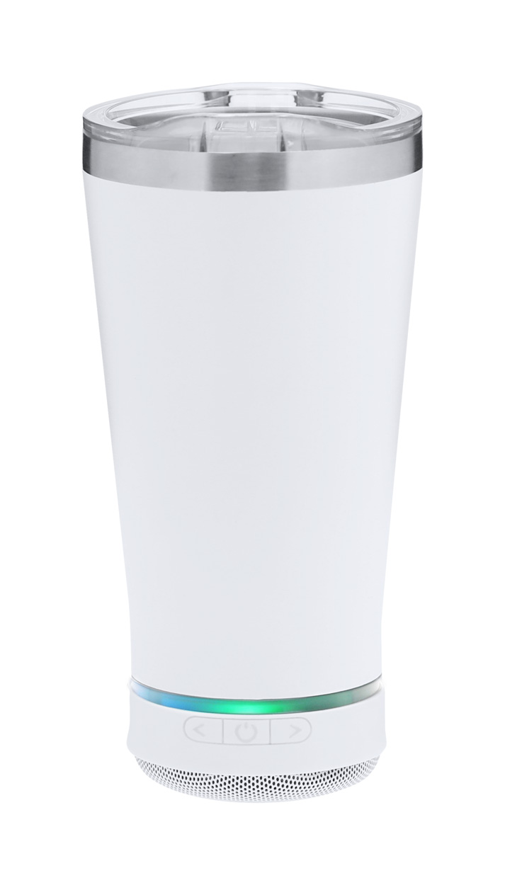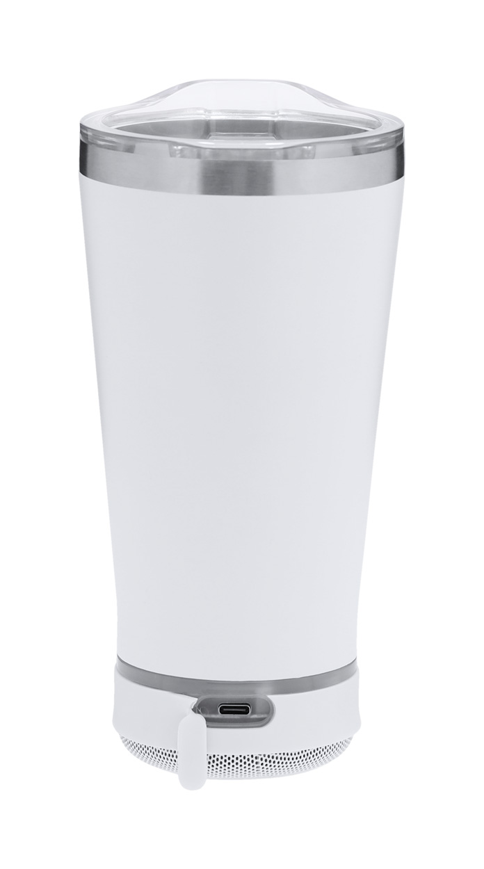 Dvoustěnný, nerezový izolovaný termo hrnek s víčkem na pití a bluetooth reproduktorem s vícebarevnými LED světly, funkcí hands-free volání a vestavěnou dobíjecí baterií. 440 ml.