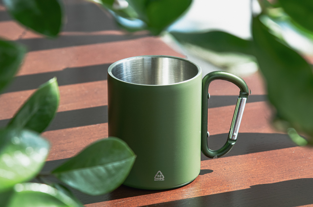 Dvoustěnný termo hrnek z recyklované nerezové oceli s karabinou z recyklovaného hliníku v odpovídající barvě. 300 ml. V kraftové papírové krabici.