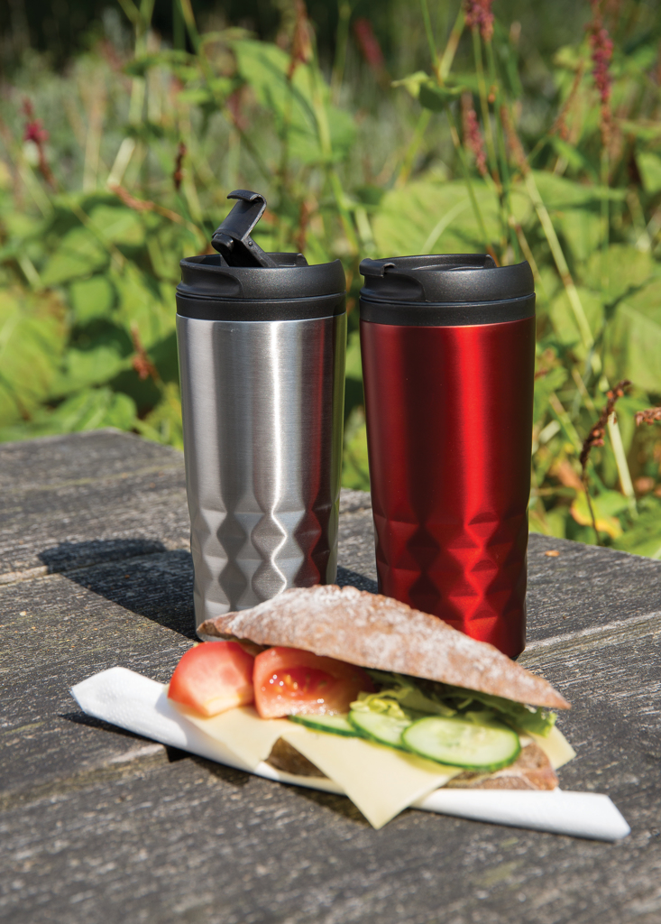 Módní termohrnek z nerezavějící oceli s geometrickým vzorem. Vnitřní tělo vyrobeno z PP. Pouze pro ruční mytí. Objem 300ml.