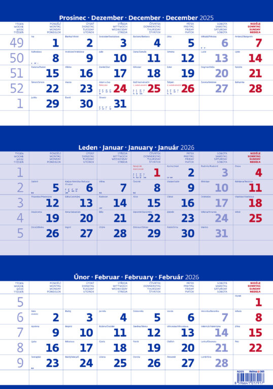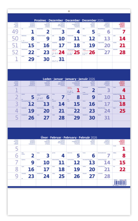Formát kalendáře: 31,5 x 45 cm Kalendárium: české tříměsíční s poznámkami, jmény a se svátky vybraných evropských států (CZ / SK / A / B / D / F / H / CH / I / PL / RUS / UKR) Rozsah kalendáře: 12 listů Prostor pro přítisk: 31,5 x 7 cm Součástí celého balení je 20 kusů laší zdarma