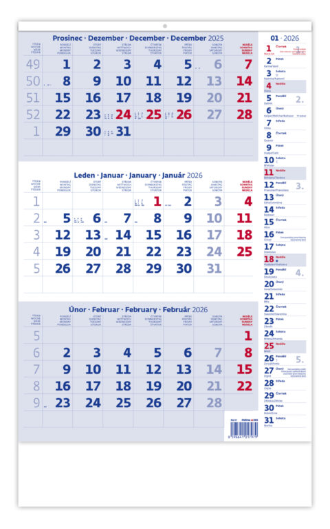 Formát kalendáře: 31,5 x 45 cm Kalendárium: české tříměsíční s poznámkami, jmény a se svátky vybraných evropských států (CZ / SK / A / B / D / F / H / CH / I / PL / RUS / UKR) Rozsah kalendáře: 12 listů Prostor pro přítisk: 31,5 x 7 cm Součástí celého balení je 20 kusů laší zdarma