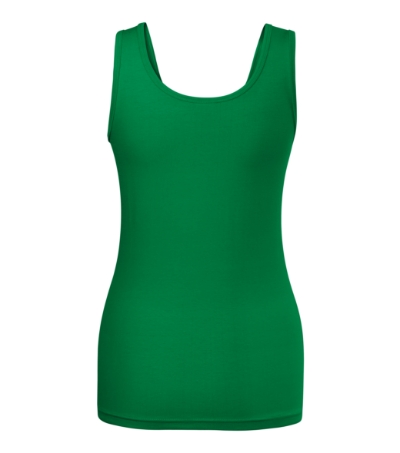 strečový materiál udržující stálost tvaru, přiléhavý střih s bočními švy, hlubší kulatý výstřih, průkrčník a průramky lemovány vrchovým materiálem, širší ramínka