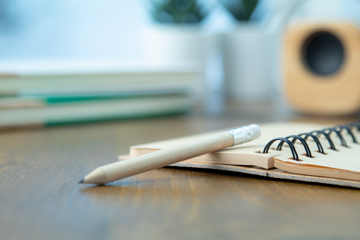 Mini dřevěná tužka v přírodní barvě s gumou, ořezaná.