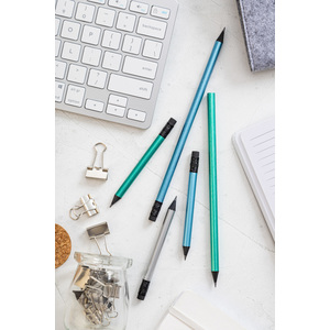 Černá dřevěná mini tužka v metalickém provedení s černou gumou. Ořezaná, třída HB.