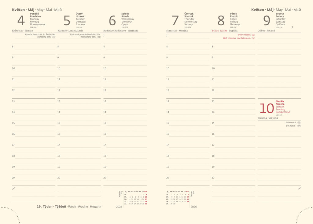 Formát diáře: 145 x 205 mm Rozsah diáře: 128 stran Kalendárium: týdenní + praktická kapsička + poutko na tužku + ořízka v barvě diáře + papír bloku chamois