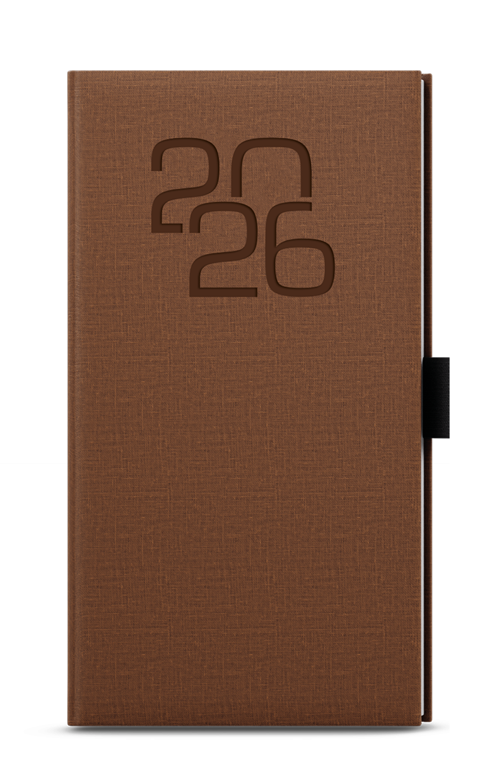 Kapesní týdenní diář z příjemného materiálu v hnědé barvě a s moderní ražbou roku. Trendy a praktický doplněk do každé kapsy. Diář má velký prostor pro poznámky a plánování.