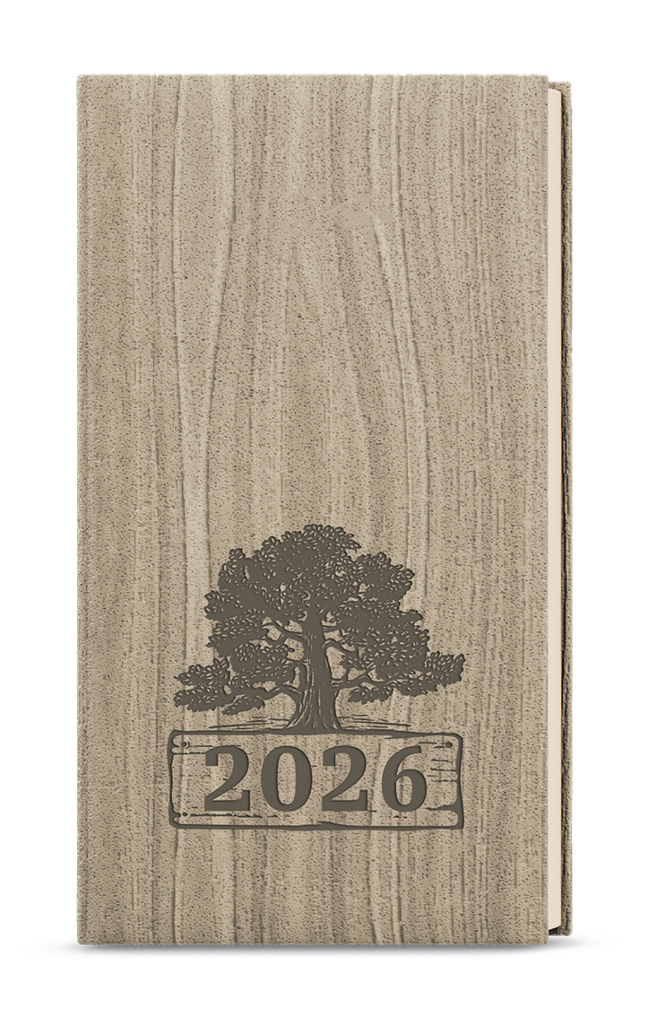 Kapesní týdenní diář s přírodním motivem dřeva s ražbou. Je vyráběný z jemně strukturovaného materiálu, má velký prostor pro poznámky a plánování.