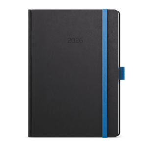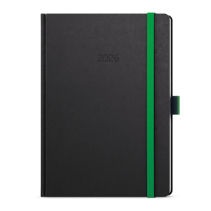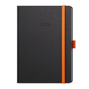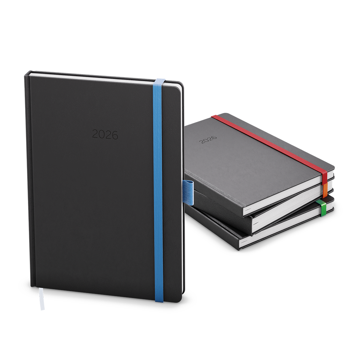 Neobyčejný týdenní diář s matným povrchem ze strukturovaného materiálu s červenou gumičkou a poutkem. Je vyráběný ve formátu A5, má velký prostor pro poznámky a plánování.