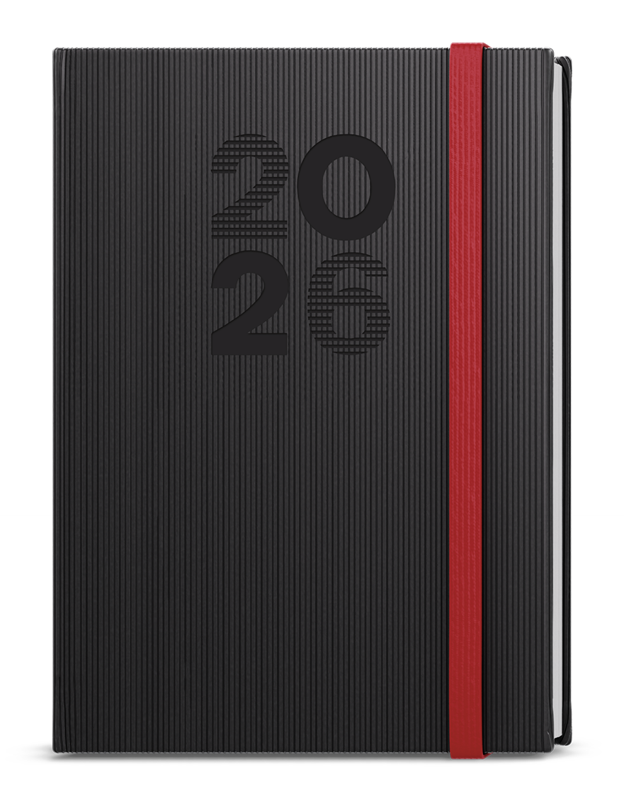 Týdenní diář formátu A5 vyrobený ze strukturovaného materiálu v černé barvě a s gumičkou. Oblíbená grafika vnitřního bloku Vám pomůže účelně plánovat Vaše dny.