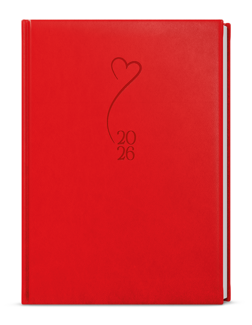 Červený týdenní diář vyráběný z jemné hladké vivelly s efektní ražbou motivu Srdce. Formát A5 je vhodný do tašky a má velký prostor pro poznámky a plánování.