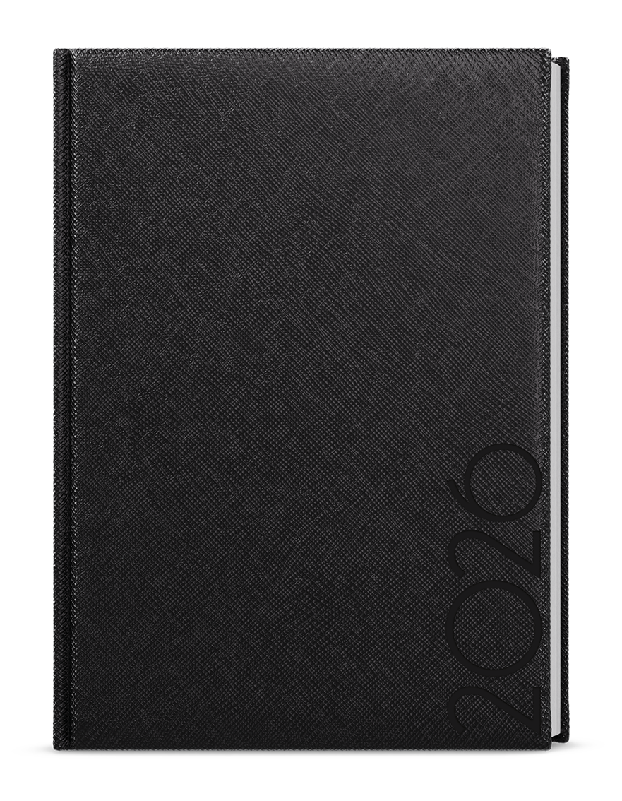 Týdenní diář v černé barvě se strukturovaným povrchem. Moderní doplněk v oblíbeném formátu. Diář má velký prostor pro poznámky a plánování.