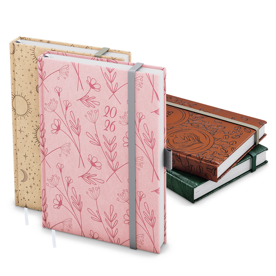 jemný hladký materiál, celoplošná ražba motivu včetně ražby roku, šitá vazba V8, stužka, gumička, poutko na propisku, perforované rožky, vlepená kapsa, ofset, 70g/m2